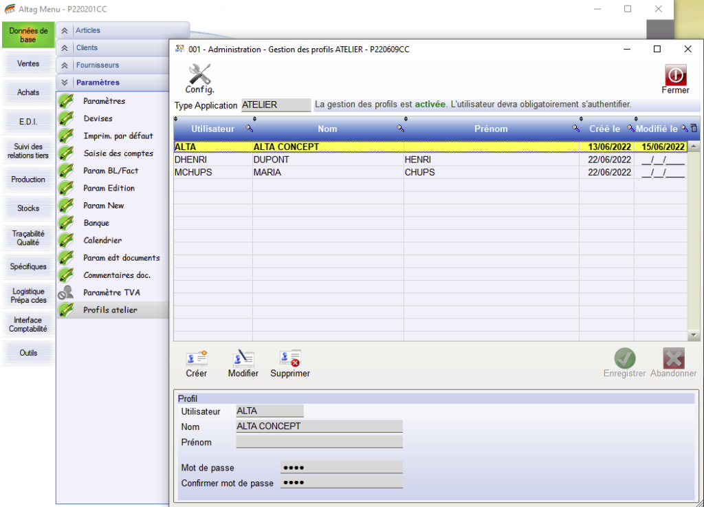Cette interface est le seul écran permettant de gérer / modifier les profils et les mots de passe. Les applications de préparation de commande ne permettent pas aux préparateurs de changer leur mot de passe.