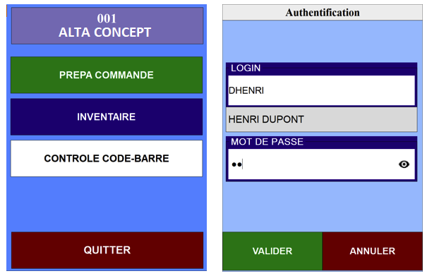 Depuis le menu Pocket, l’écran d’authentification s’affiche au lancement de l’application ‘PREPA COMMANDE’ :
