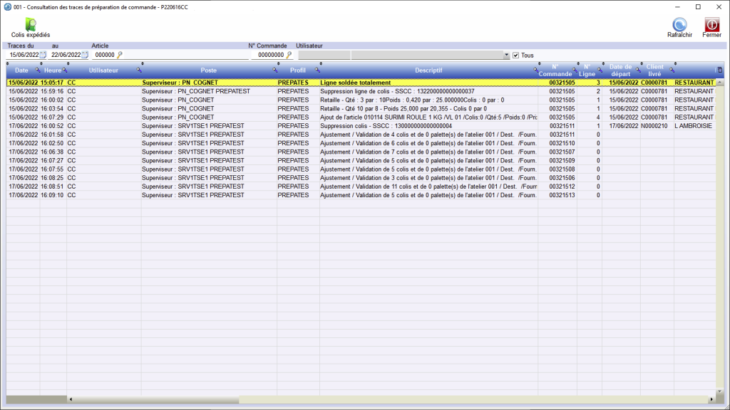 Option disponible dans le menu sous Logistique Prépa Cdes >> Logistique Prépa Cdes >> Traces Prépa Cdes