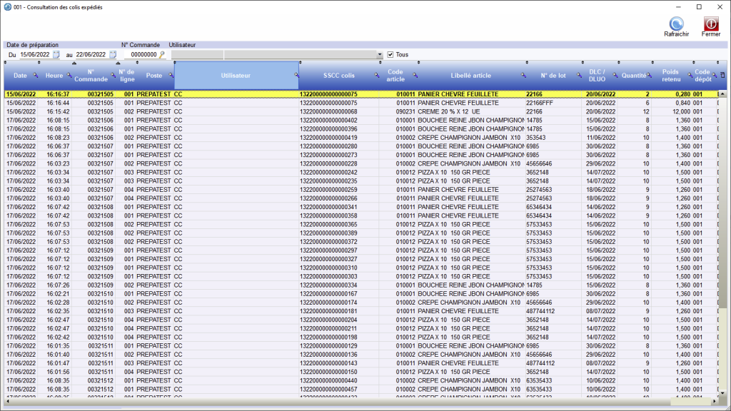 Le second écran permet de visualiser le détail des colis expédiées avec les informations, article, lot, DLC, qté et poids préparés.