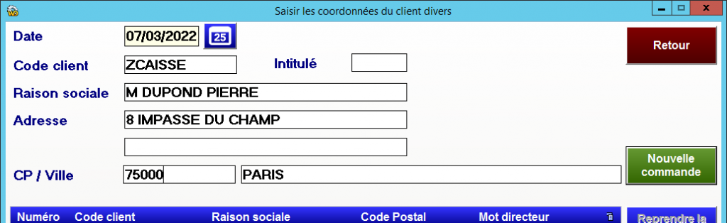 Lors de la sélection d’un client divers, ses informations personnelles seront à saisir.