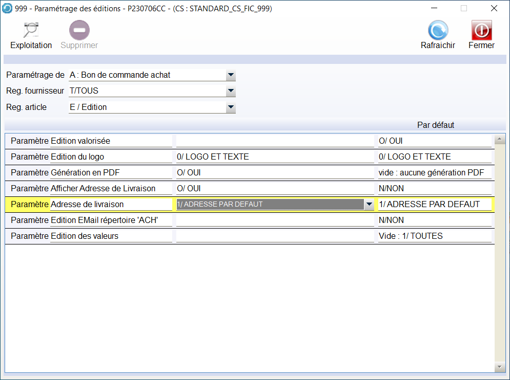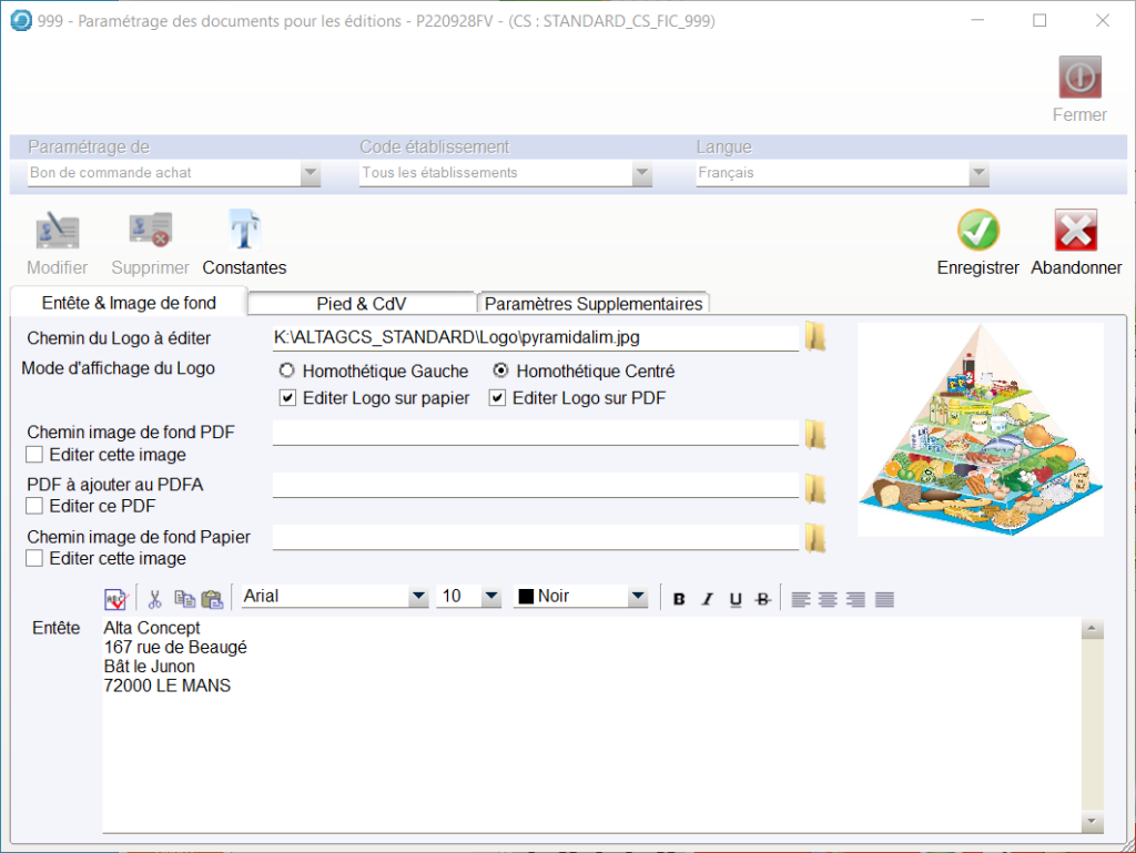 Des paramètres sont à définir afin de pouvoir intégrer ou non, le logo, l’adresse de livraison, la génération du PDF, dans la mise en page des Bons de Commandes Achats.