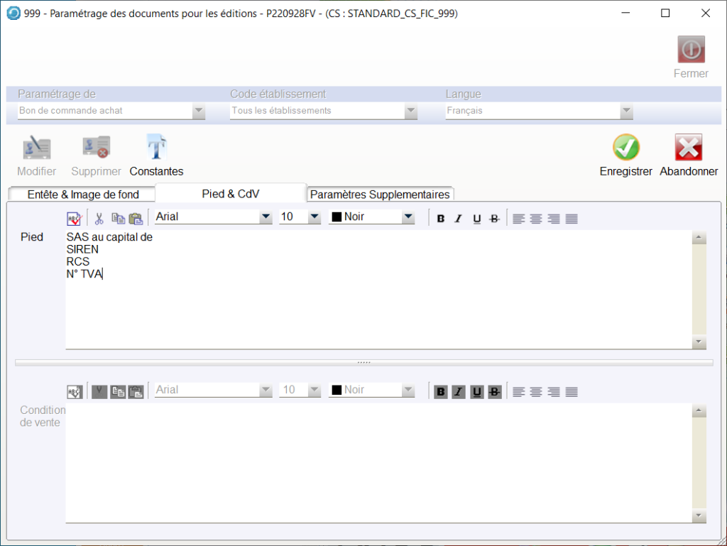 Les Conditions de vente se renseignent par la fonction :