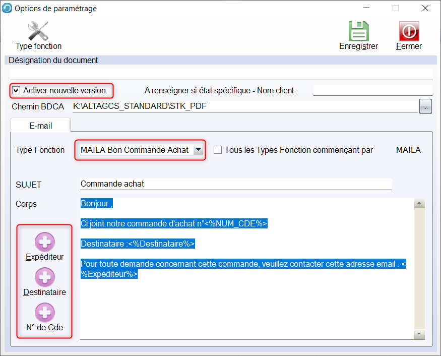 Les boutons Expéditeur, Destinataire et N° de Cde permettent d’intégrer automatiquement les références dans le corps du message.