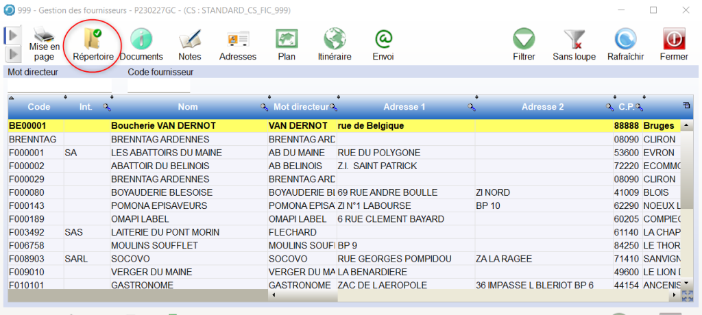 Pour se faire, il faut sélectionner la ligne du Fournisseur pour lequel il faut paramétrer l’e-mail, puis cliquer sur le bouton « Répertoire ».