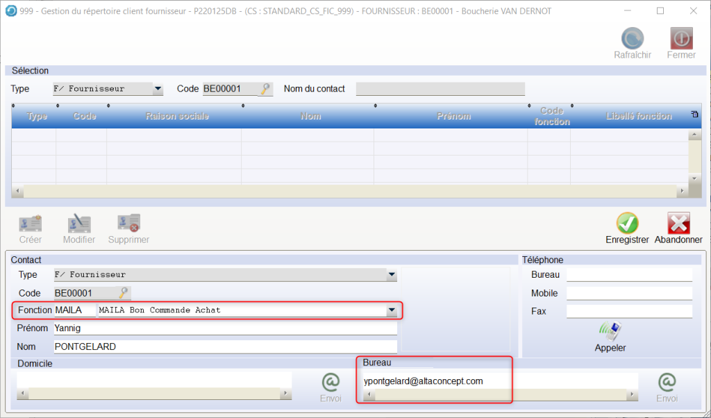 Pour que l’e-mail contenant le BCA s’envoie automatiquement, il est nécessaire de paramétrer cette coordonnée dans la fiche fournisseur.