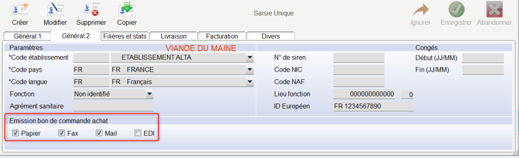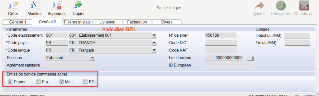 Le Type d’émission du BCA en fonction du Fournisseur se fait dans l’Onglet « Général 2 » de la Fiche