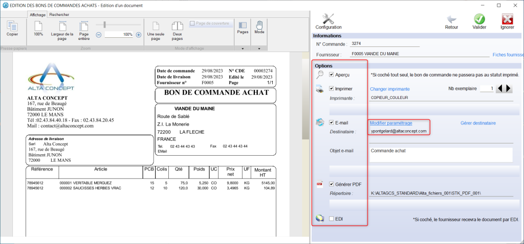 Le fait de cliquer sur le bouton « Valider Cde » ouvre la fenêtre de prévisualisation du BCA avant envoi, sauvegarde PDF, et/ou impression.