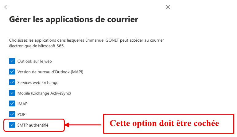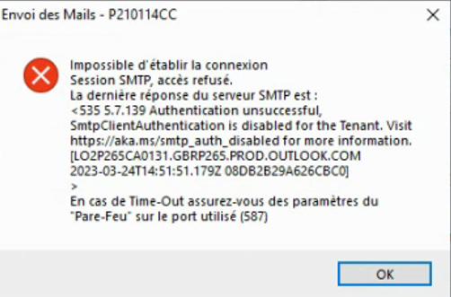 L’option SMTP authentifié doit être activée sous office365 par l’administrateur (prestataire) sur le portail Office du client, pour la boîte mail en question.