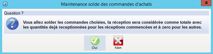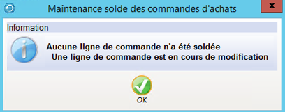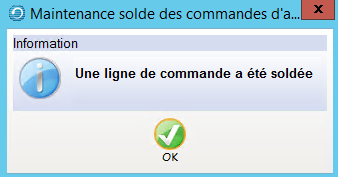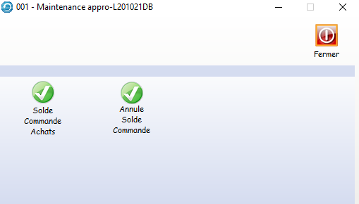 Cet outil permet de solder les commandes d’achats non réceptionnées. Afin de pouvoir inverser l’action de solde des commandes d’achats, un outil de « dé-solde » des commandes d’achats est implanté. Ces actions ne modifient pas les quantités de stock.