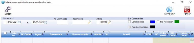qui permet de remplir la table de cette fenêtre. Lorsque la table est remplie des cases à cocher sont utilisées pour sélectionner les lignes de commandes que l’on veut solder.