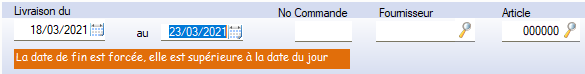 Dans le cas d’un affichage sans verrouillage le code des couleurs est respecté les lignes écrites en noir sont les lignes de commandes non commencées, en vert pré-réception, en bleu commencées. Les lignes de commandes terminées ne sont pas affichées.