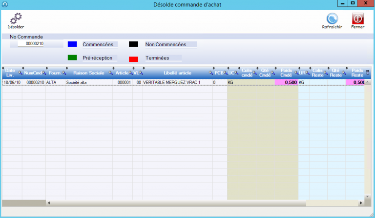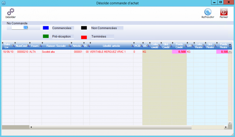Dans le programme « exploitation des commandes » une commande reste « en attente » même si l’enregistrement FGCTER = « T ». Pour le dé-solde des commandes, cette même commande est affichée en rouge ( commande terminée ) alors qu’elle reste affichée en violet ( commande en attente ) dans le programme « exploitation des commandes ».