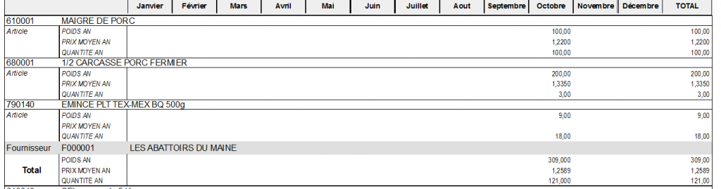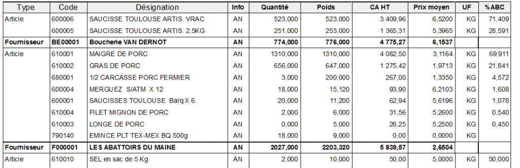 Exemple avec ABC CA , détail article , total fournisseur , prix UF