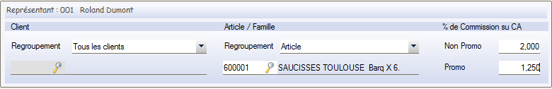 « Je veux commissionner pour le représentant « DURAND » 2% sur les ventes de saucisses natures en vrac mais 1,25% s’il y a des promotions, quelque soit le client ».