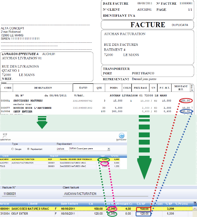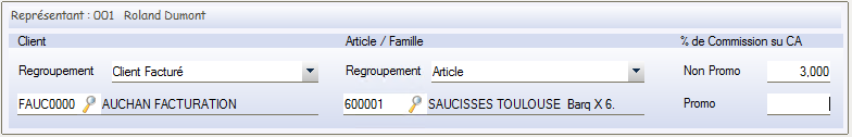 Le représentant DUMONT pour les ventes du client AUCHAN FACTURATION il aura 5% s’il vend des produit en Entrée de caisse. Il aura 3% s’il vend des saucisses de Toulouse en barquette sans promotion. Pour les autres articles, vu qu’aucun n’a été saisi, il n’aura rien. Pour les autres clients, il aura 2% s’il vend des saucisses de Toulouse en barquette sans promotion . En revanche, il aura 1,25% pour les saucisses en promotion. Pour tous les autres produits, il n’aura pas de commissions.
