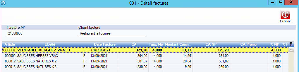 En référence au cas pratique, le représentant n’est pas commissionné sur les BOUDINS. Par conséquent la ligne de l’article BOUDINS n’apparait pas dans le détail car il n’y a pas eu de paramétrage sur ce produit.