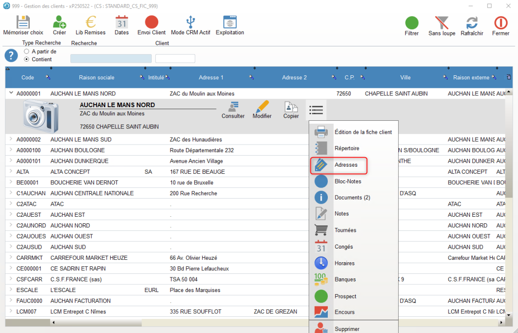 • Rechercher le Client pour lequel il faut rajouter une adresse de livraison, puis dans le premier bandeau de Bouton, cliquer sur « Adresses ».