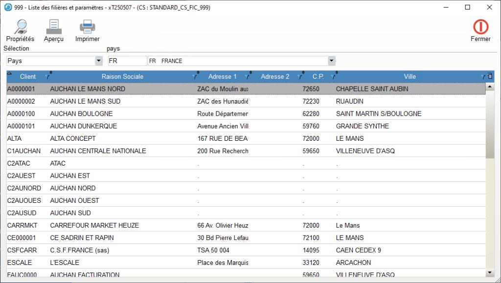 Choisir le paramètre à explorer (ici le pays) et le code du paramètre à explorer (ici GB angleterre) , le logiciel affiche la liste de tous les clients affectés au paramètre choisi.