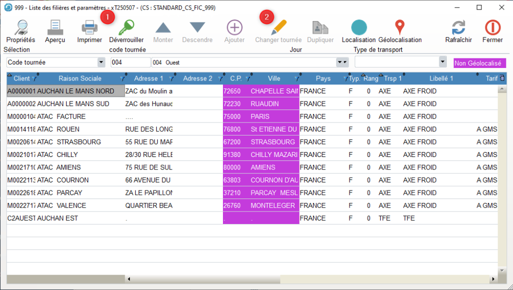 Les boutons « monter/descendre » permettent d’organiser la tournée en incrémentant le numéro de rang (numérotation de 5 en 5).