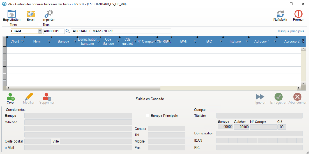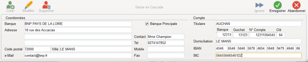 L’information « Banque principale » vous permet de savoir s’il s’agit d’un établissement principal ou secondaire, en effet, vous pourrez saisir plusieurs banques pour un tiers.