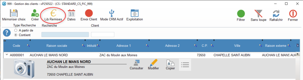Via la « fiche client » , sur la 2ème barre de fonctions