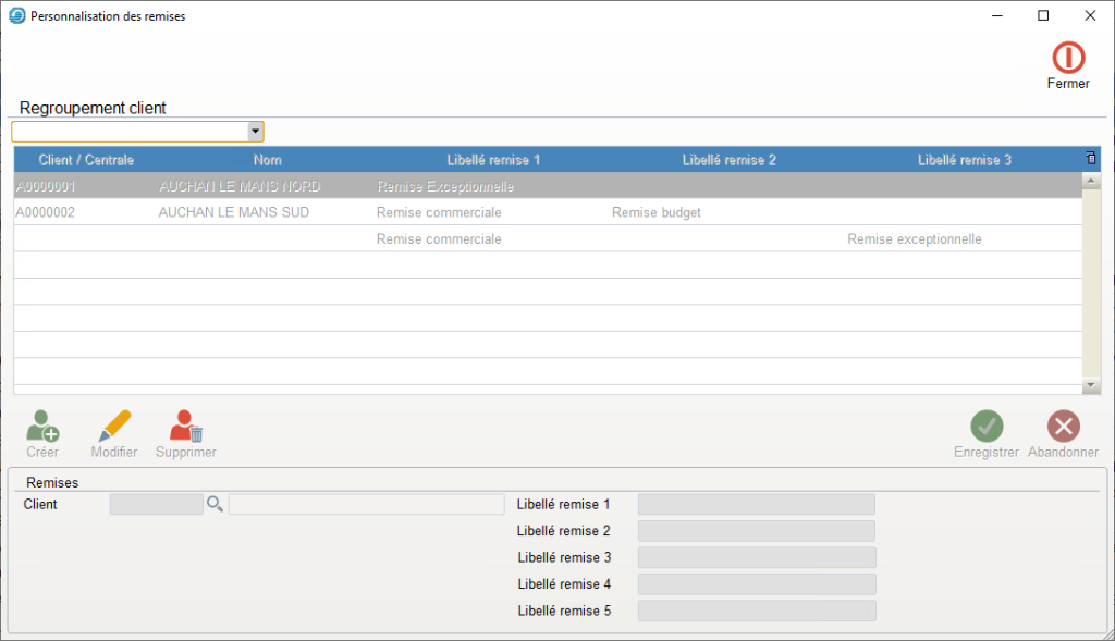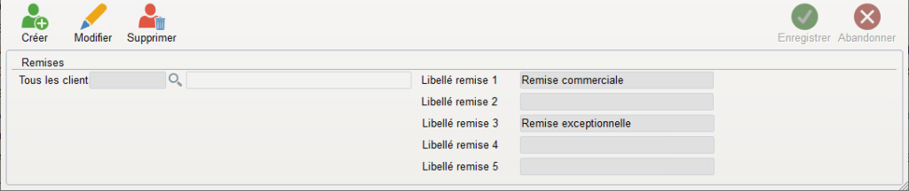Permet de personnaliser les libellés des 5 remises tarifaires , attention l absence de libellé n a aucune incidence sur la prise en compte des remises sur le calcul du prix net, ni sur l’édition de la remise sur la facture.