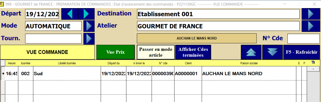Dans la vue « Préparation de Commande Atelier », les données concernant la Tournée et le Transporteur choisis, sont affichés.