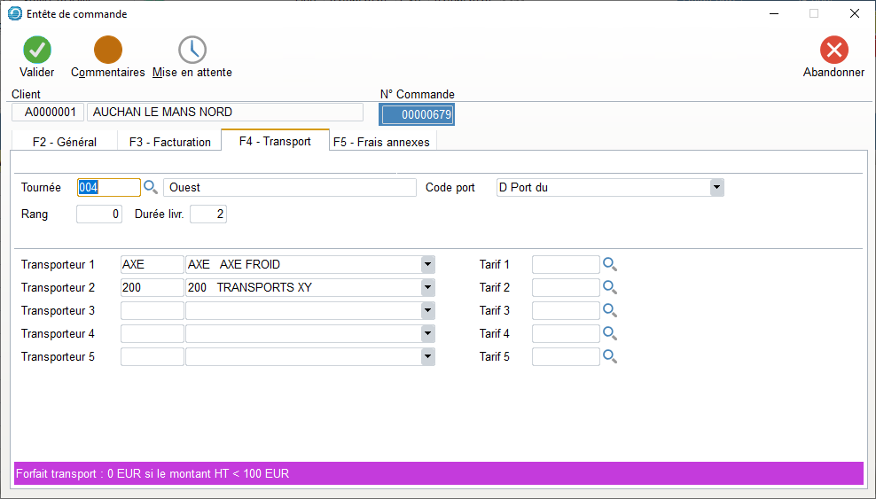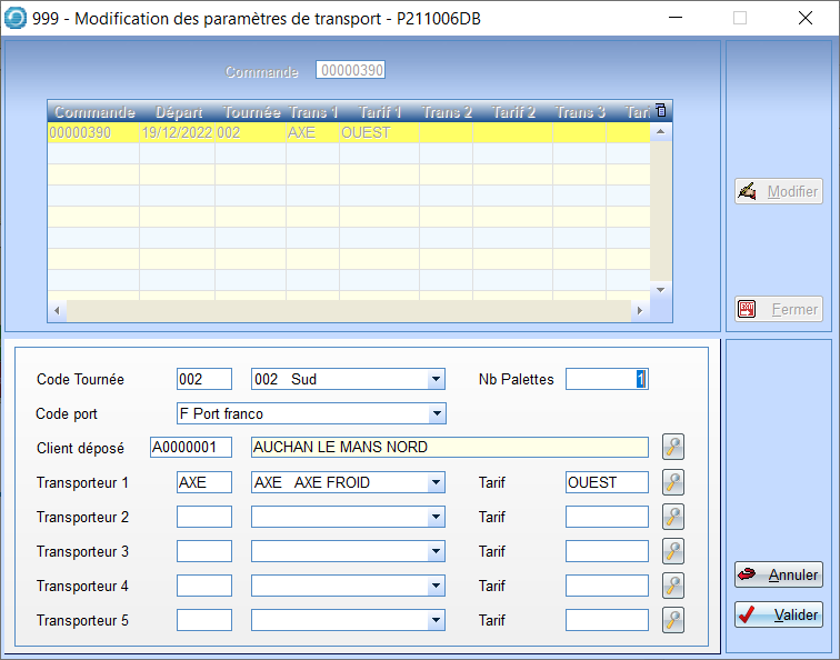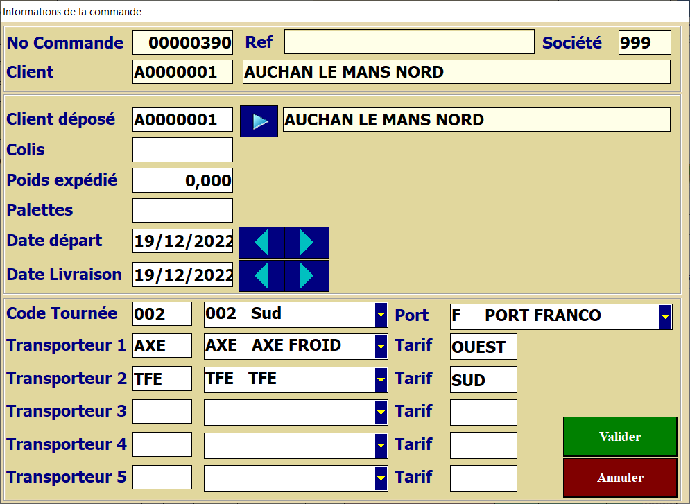 Si des Tournées avec transporteur ont été créées pour le Client de la Commande, alors choisir une des tournées paramétrée dans l’Onglet Tournée du Client.