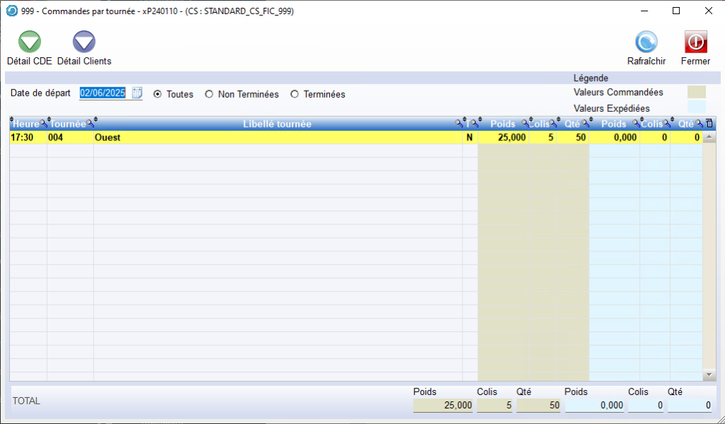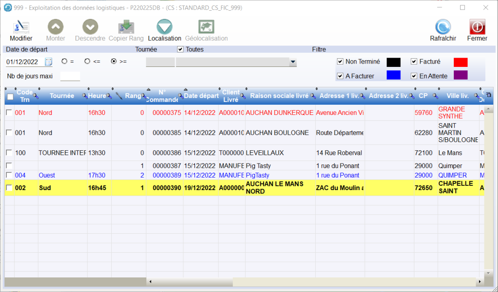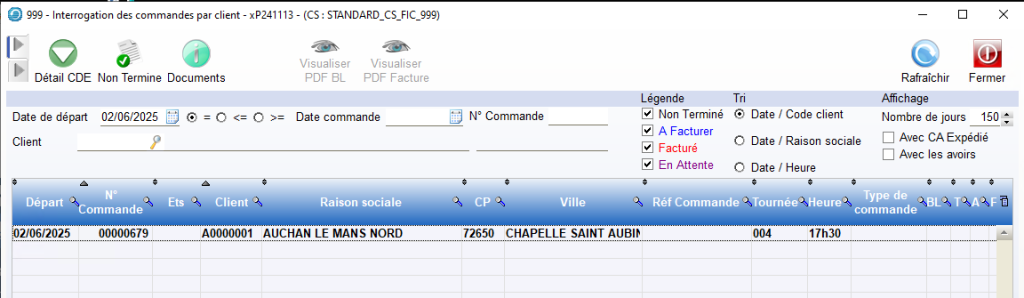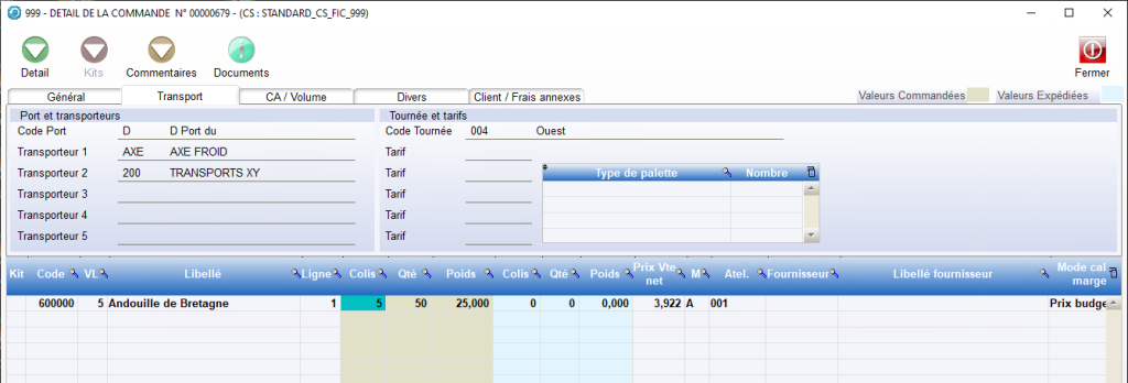 Il est également possible de consulter les données de Transport par Commande de la même manière que précédemment, dans le Module Ventes / Exploitation / Cdes/Tournées