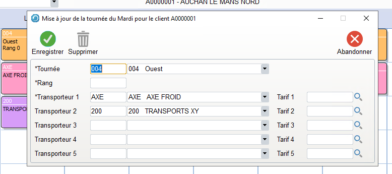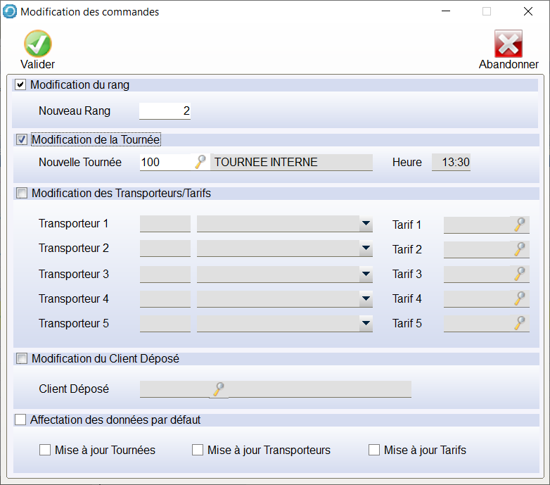 En fonction des choix effectués lors de ces modifications, les Tournées, les Transporteurs et les Tarifs peuvent ainsi être affectés par défaut.