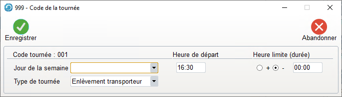 Après avoir créé le Code et le Libellé, il faudra déterminer le jour de la semaine et l’heure de départ, ainsi que le Type de tournée (Transporteur ou Retrait sur place).