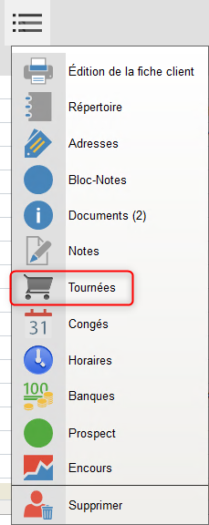 Dans le premier bandeau de boutons de la Fiche Client, cliquer sur « Tournées ».