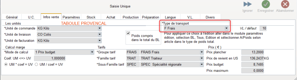 Il est important, en premier lieu, de définir le « Type de Transport » de l’Article dans le Module Données de base / Articles / Articles Onglet Infos vente.