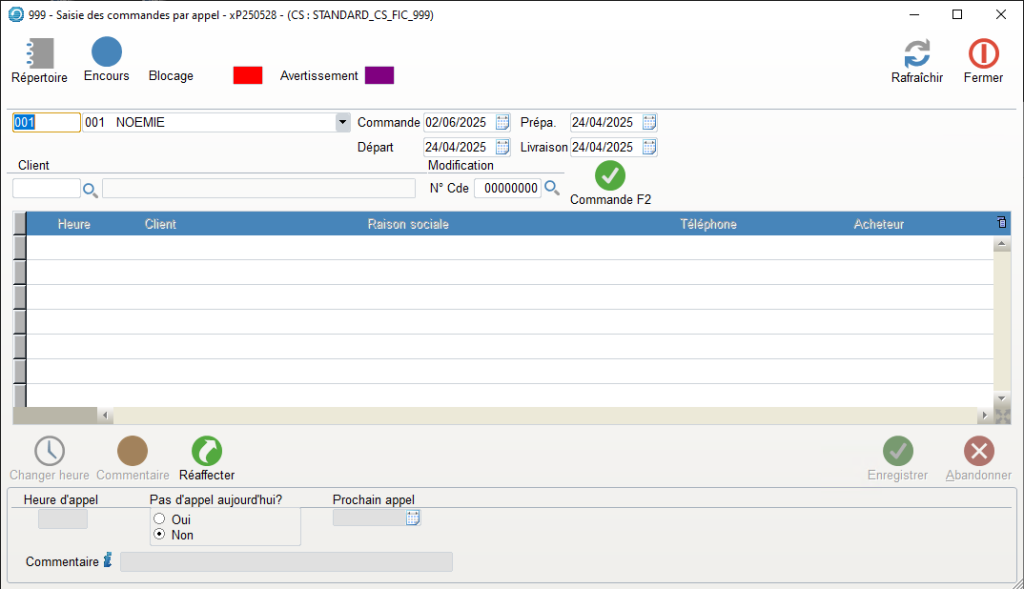 Cela veut dire qu’en Saisie de commande, dès 11 h 30 (30 min avant 12 h 00), un avertissement s’affichera sur l’écran : vous n’aurez pas le temps de préparer votre commande.