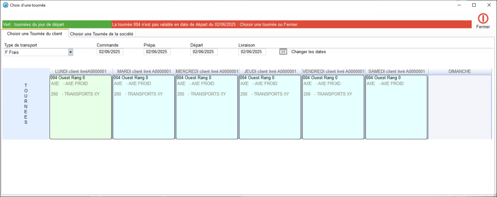 S’il n’existe pas de Tournée Client, alors, dans l’Onglet Tournée de la Société, choisir la tournée adéquate en fonction de la date de livraison.