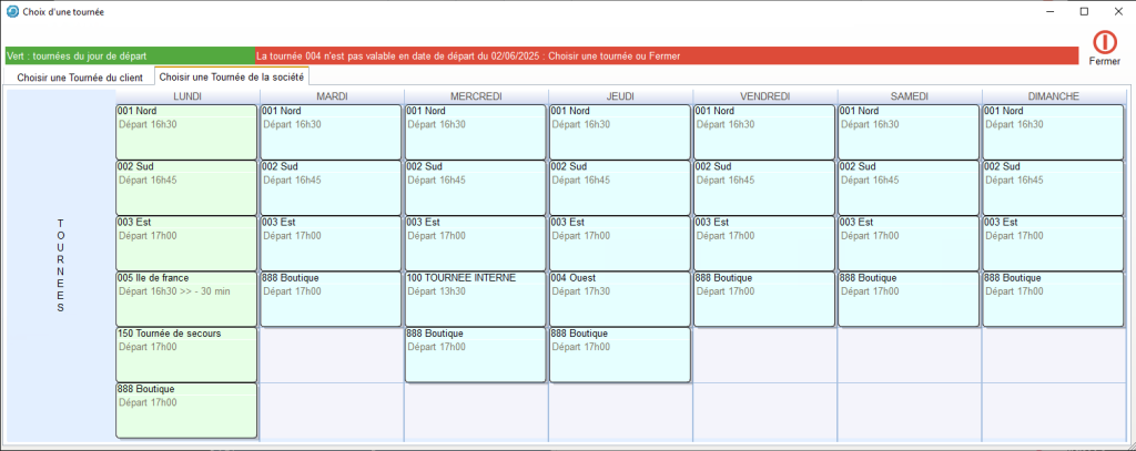 Si une Tournée est choisie en saisie de commande sur un mauvais jour, une alerte apparait. Il faut être rigoureux à la création des Tournées, cela évite les alertes et les erreurs en Saisie de Commande.