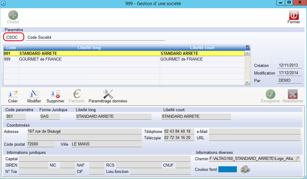 Paramétrage Société Alta G’