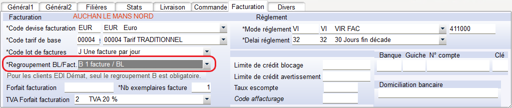 Obligation de sélectionner dans Regroupement BL/Fact, B correspondant à une facture par bon de livraison.
