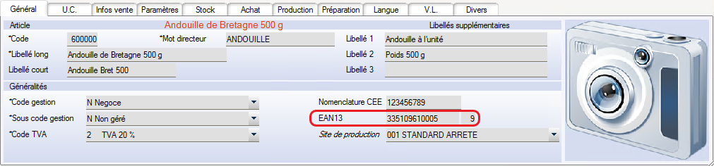 Renseigner l’EAN13 de chaque article concerné par l’EDI (EAN fourni par GS1 ou interne à la société).