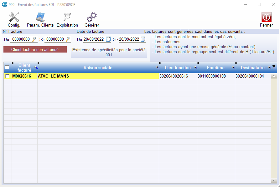 Cet écran présente la liste des Clients Facturés paramétrés pour l’envoi de Factures ou Avoirs EDI.