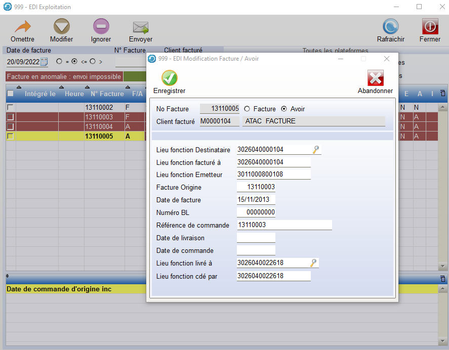 L’Envoi des pièces (Facture ou Avoir) ne peut s’effectuer qu’en l’absence d’anomalies (Manque du Référence Commande, absence de Lieu Fonction sur Client Facturé ou Livré, absence de Date de Commande d’origine, etc…)