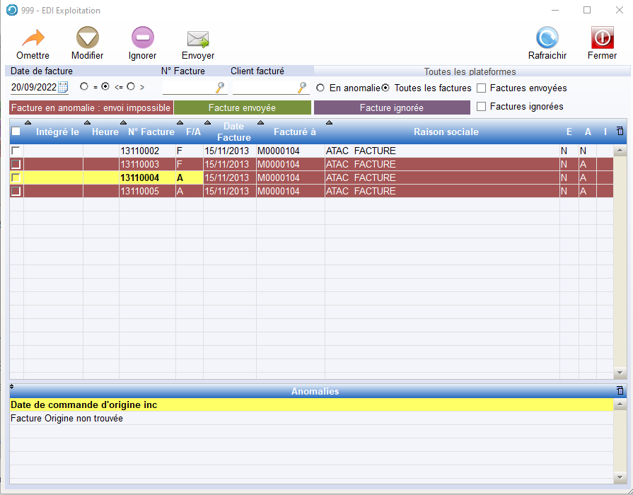 C : Fond Rouge>Les Factures/Avoirs qui sont en Anomalies. Ces Factures/Avoirs ne pourront pas être envoyés avec ce statut Anomalie ; pour pouvoir Envoyer ces pièces, il faut corriger les anomalies en actionnant le bouton Modifier.
