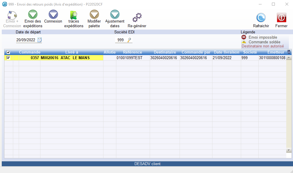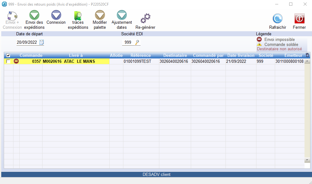 Via le bouton Trace des expéditions qui permet de visualiser les desadv envoyés par date de départ et de les renvoyer si besoin.