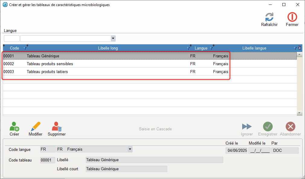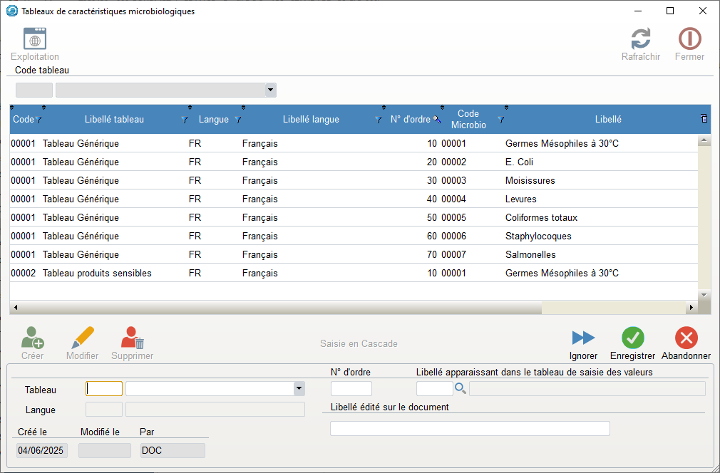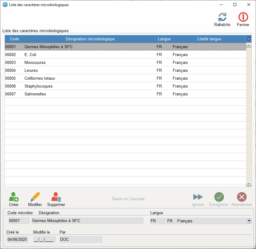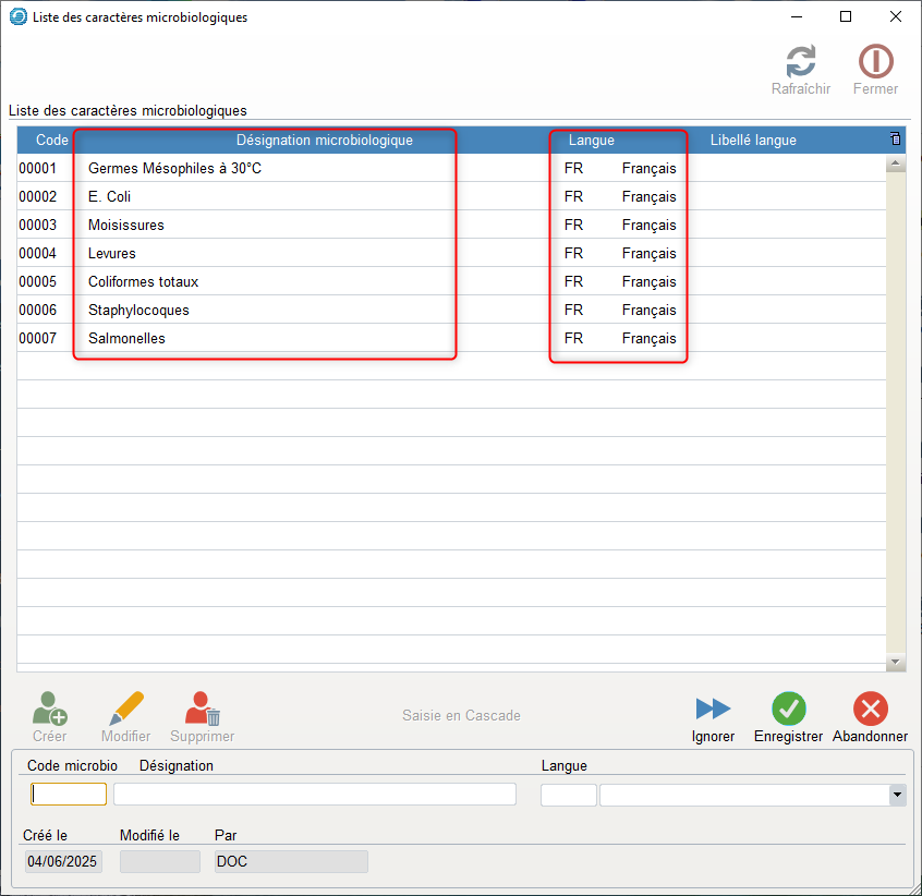 - Les codes langues sont saisis dans le tableau de paramétrage. Ils sont associés aux caractéristiques microbiologiques.