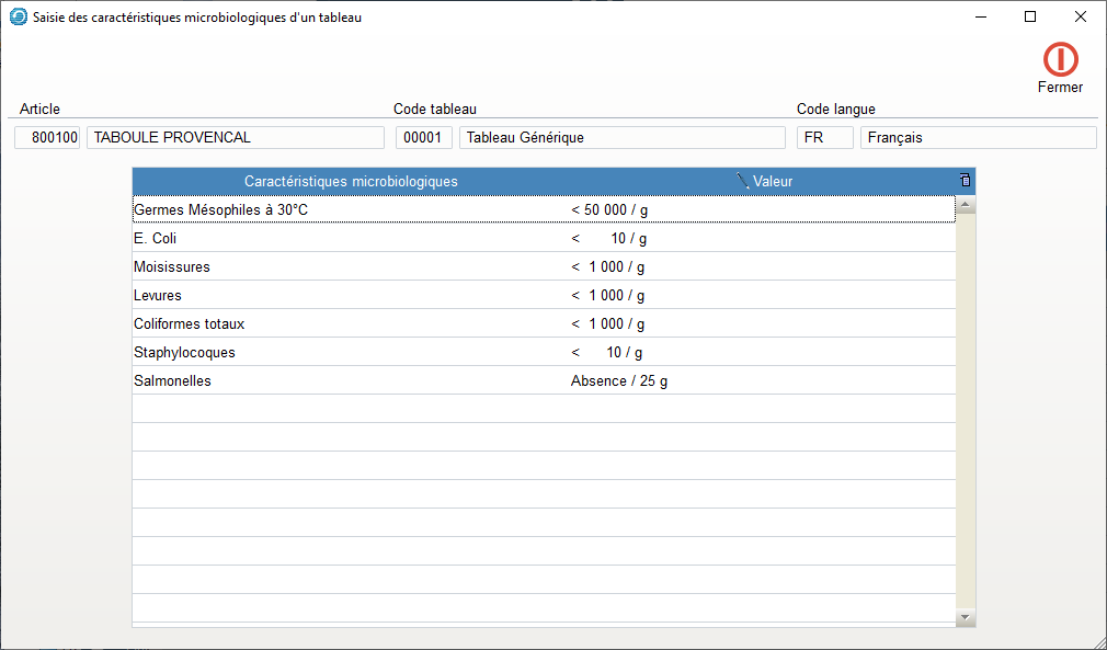 - Il faut créer au moins un tableau par langue, et par même regroupement de caractéristiques microbiologiques.