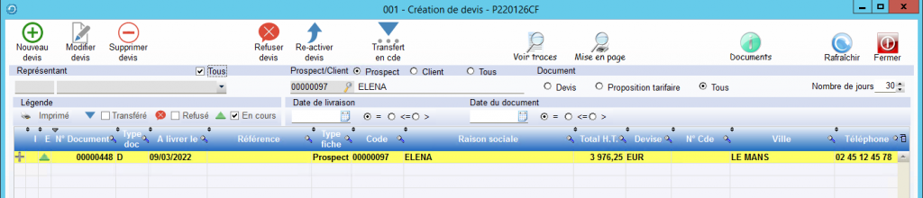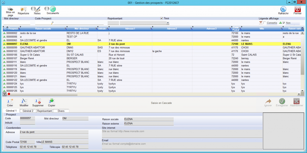 • Dans la fenêtre ci-dessous, le Prospect « 00000097 » a été sélectionné.