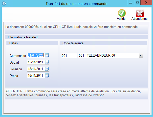 • Seuls les devis sur des clients peuvent être Validés en commande.