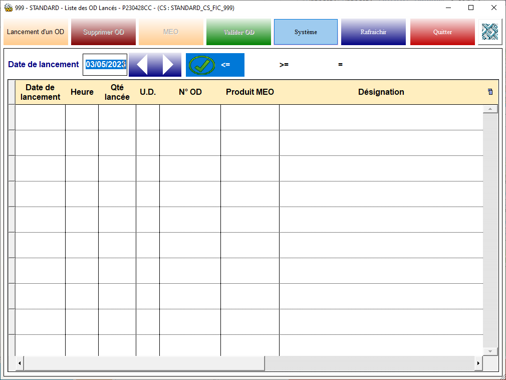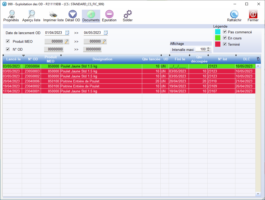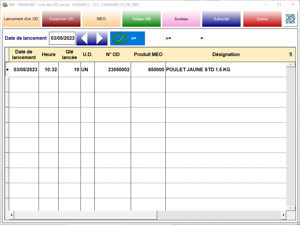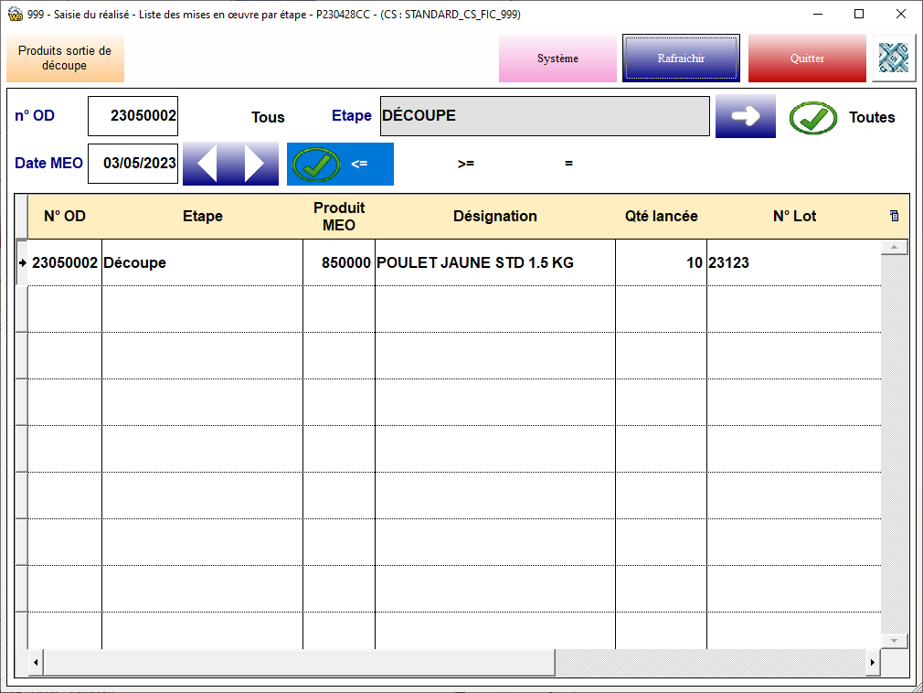 Si tous les réglages sont validés, alors sélectionner la Ligne du N° d’OD souhaité, puis cliquer sur le Bouton « Produits sortie de découpe ».