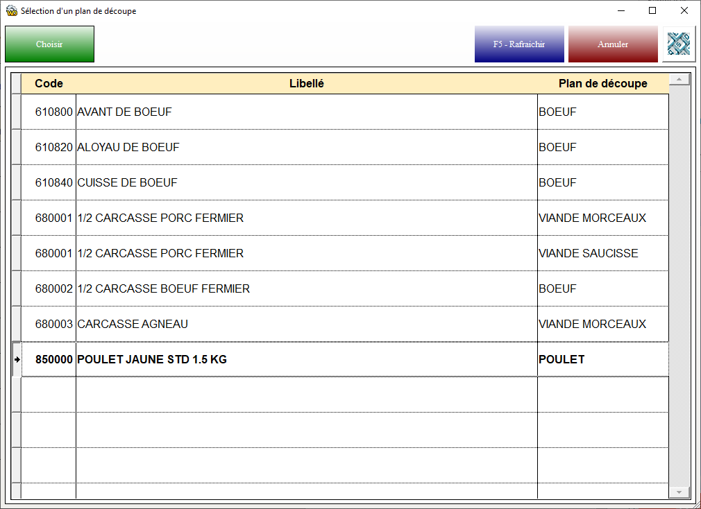 Selon le paramétrage effectué dans les Plans de Découpe, le « Produit Entier » correspondra au produit de base à toutes les découpes postérieures.